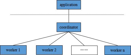 集群中的节点分为两类:一个协调节点(master或者coordinator)和若干工作节点(worker)。应用程序(application)将查询发送给协调节点,协调节点再将查询发送到工作节点上,并收集返回的结果。