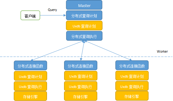 uxdb mpp集群由master实例和多个worker实例组成。master上存储有关分片的元数据,worker上存储分片数据和复制数据。发布到集群上的所有查询通过master执行,master将查询分为较小的查询片段,其中每个查询片段可在分片上独立运行;然后,master将查询片段分配给worker,监督其执行,合并其结果,并最终返回给用户。