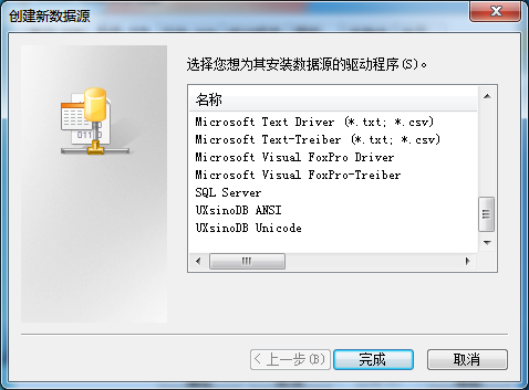 3. 在ODBC驱动器程序列表中,选择【UXsinoDB ANSI】或【UXsinoDB Unicode】,单击【完成】按钮,系统弹出【UXsinoDB ANSI/Unicode Driver (uxsqlODBC) Setup】对话框。