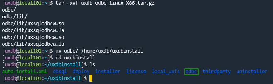 下载与数据库版本对应的uxdb数据库odbc驱动程序包(uxdb-odbc_linux_X86.tar.gz),进行解压,将解压之后的文件夹移动到数据库安装路径下,uxdb数据库安装路径为/home/uxdb/uxdbinstall。