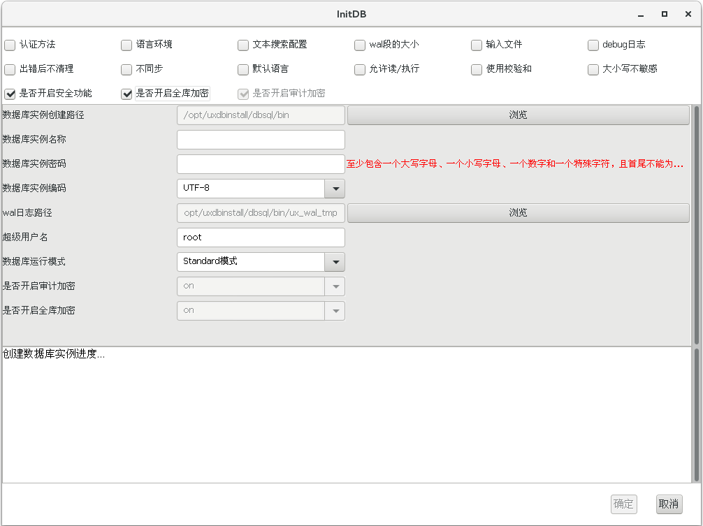 初始化带有安全功能的UXDB实例。安全功能请参见《优炫数据库管理系统安全功能手册》。
