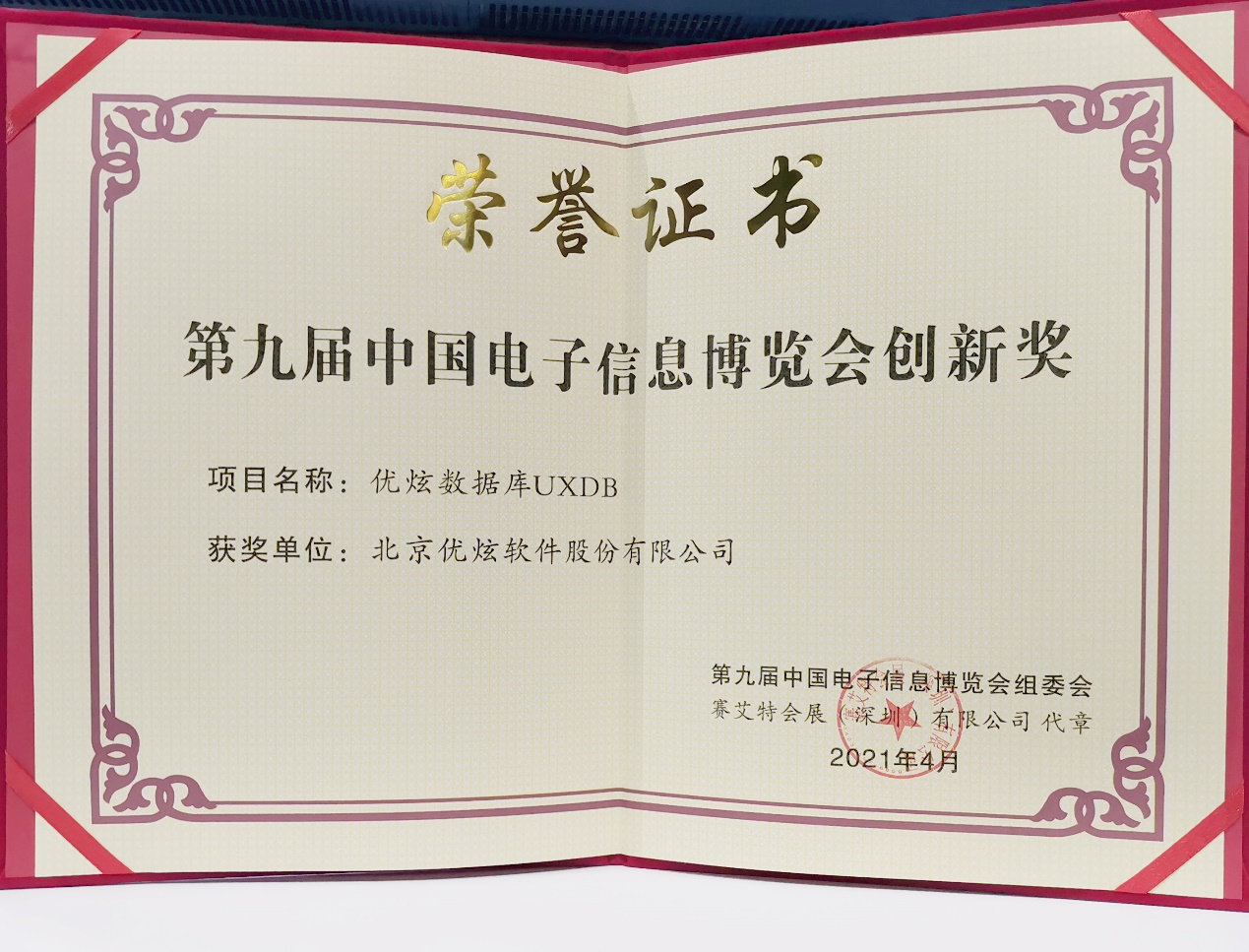 4月9日,第九届中国电子信息博览会(CITE 2021)在深圳会展中心隆重开幕。作为国产数据库代表厂商、信创产业链条上的主力军,优炫软件受邀出席大会,全面展示优炫在国产数据库领域的技术创新实践,并荣获“中国电子信息博览会创新奖”。