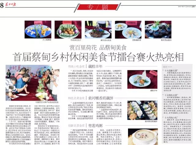 吃货的眼里,蔡甸可是块宝地。蔡甸素有“鱼米之乡”的美誉,农产品质量优异,“蔡甸莲藕”、“蔡甸西甜瓜”、“蔡甸沉湖鳙鱼”、“蔡甸藜蒿”、“索子长河草鱼”都是声名远播的国家地理标志保护产品。蔡甸更是著名的“中国厨师之乡”,美食小吃俯拾即是,吃货们到了蔡甸,个个都是流连忘返。