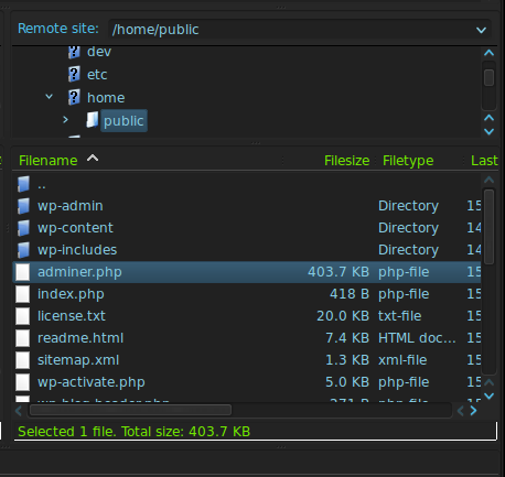 在你自己的电脑上安装Filezilla(与Windows、Linux、Mac系统兼容),从Adminer网站下载PHP文件,确认已经获得FTP主机名、用户名与密码。