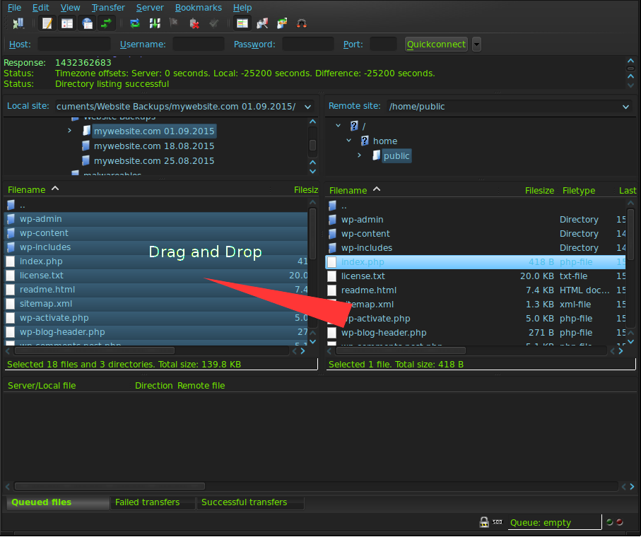 现在开始文件传输。这个过程会花一点时间,特别是如果你的网站上有很多照片或插件,又或者你的网站运行在一个速度很慢的服务器上。