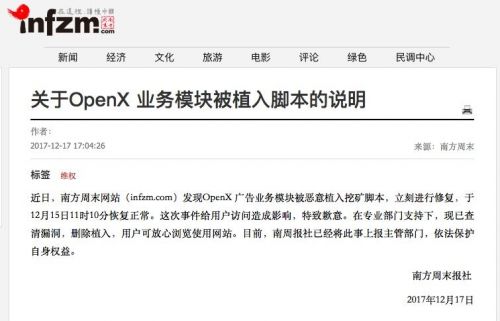 2017年12月16日,南方周末的网站主页也被曝出挂了加密货币的挖矿脚本,访问时CPU会被占满。 17日下午,南方周末发布了有关说明,称网站遭到入侵被黑客挂上挖矿脚本,现已查清漏洞,删除植入,用户可放心浏览使用网站。