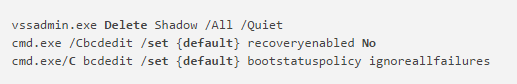 当恶意软件运行时,它就会清除Windows卷影拷贝、终止数据库进程和禁用自动修复。被终止的进程为:sql.exe、sqlite.exe及oracle.com,并执行下列命令: