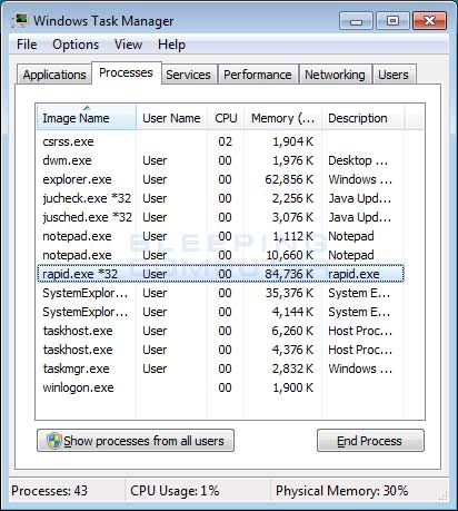 受害者如果发现Rapid恶意软件对计算机进行加密后,应尽快打开Windows进程管理器,终止关联的恶意进程。如果计算机没有被重启,运行的进程名称可能为任意名称,如样本的名称为rapid.exe(如下图)。