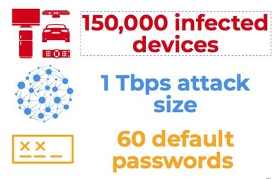 安全研究人员在2016年8月发现了Mirai僵尸网络,该IoT僵尸网络拉开了僵尸网络威胁最新一波进化的大幕。Mirai在该年早秋正式开始兴风作浪,搞瘫了安全博主克雷布斯的网站KrebsonSecurity.com,并以创纪录的 1.5 Tbps DDoS 攻击流量让法国虚拟主机提供商OVH直接下线——该攻击至今依然保持着流量洪水纪录。专门针对IoT设备设计的恶意软件驱动了Mirai僵尸网络的所有早期活动,而且方法很是简单:用60个常见默认口令挨个尝试登录即可。