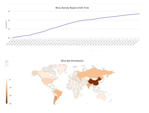 最初几次攻击过后,Mirai恶意软件的源码便在网上公开了。自此,使用该源码发起的僵尸网络攻击迅速增多。360网络安全实验室的研究人员自Mirai出现伊始就一直跟踪记录遭其入侵的设备:截止去年夏天,在不到一年的时间里,Mirai累计感染了270万台IoT设备。
