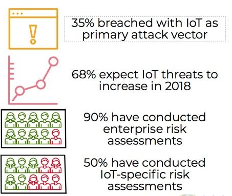 AT&T全球网络安全状态报告称,35%的企业认为IoT设备是过去12个月里数据泄露的主要源头,其中68%预测IoT威胁在2018年还会继续增长。90%的企业在去年已进行了全面网络风险评估,但仅50%执行了特别针对IoT威胁的风险评估。