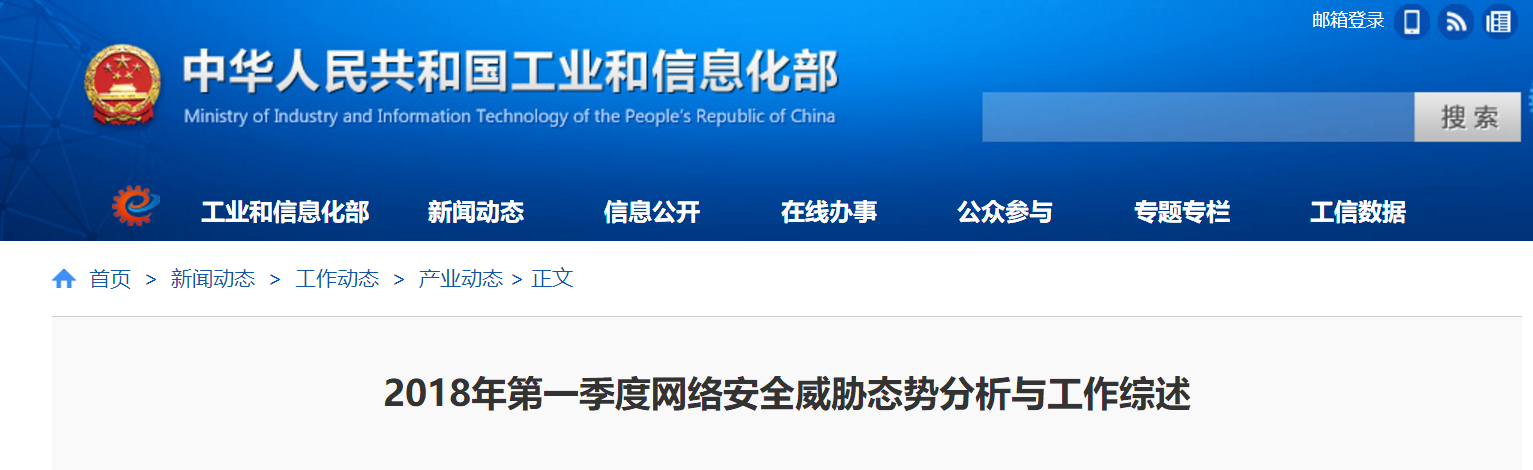 近日,工信部发布《2018年第一季度网络安全威胁态势分析与工作综述》,总结了我国第一季度的网络安全态势,分析潜在威胁,并为接下来的网安工作指路。