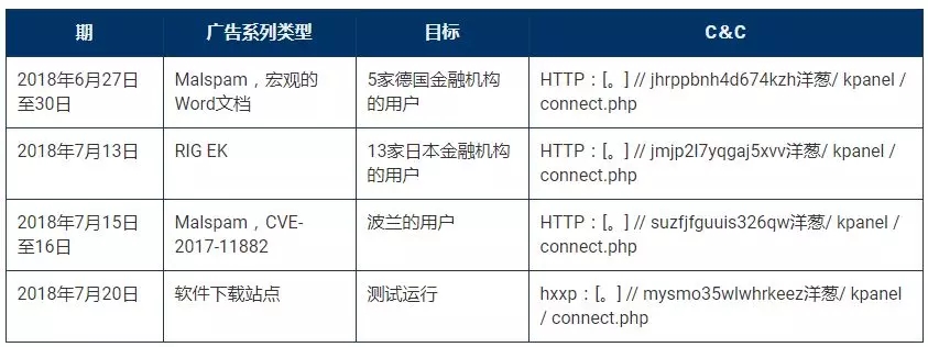 Proofpoint报告发现了三个活动和一个测试运行,活动主要针对德国,日本和波兰银行的用户。