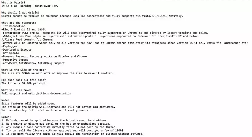 研究人员说,与此同时,这种新的Kronos变种开始出现在他们的雷达上,一名恶意软件作者开始在黑客论坛上宣传一种新的银行木马,他称之为Osiris。