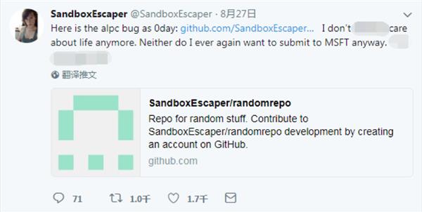 近日,一名ID为SandboxEscaper的国外安全研究人员在twitter上公布了一个类似零日的Windows10本地提权漏洞,并将相关信息也发布在Github上。不过,作者随后已经把此条twitter删除,并称“不想再提交给微软了”。