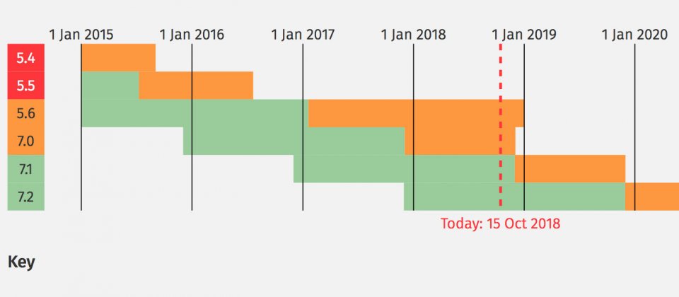 事实上PHP 5.6版的主要及安全更新期早就结束,但因使用的网站最多,因而PHP维护组织曾一度分别延长4个月及2年。