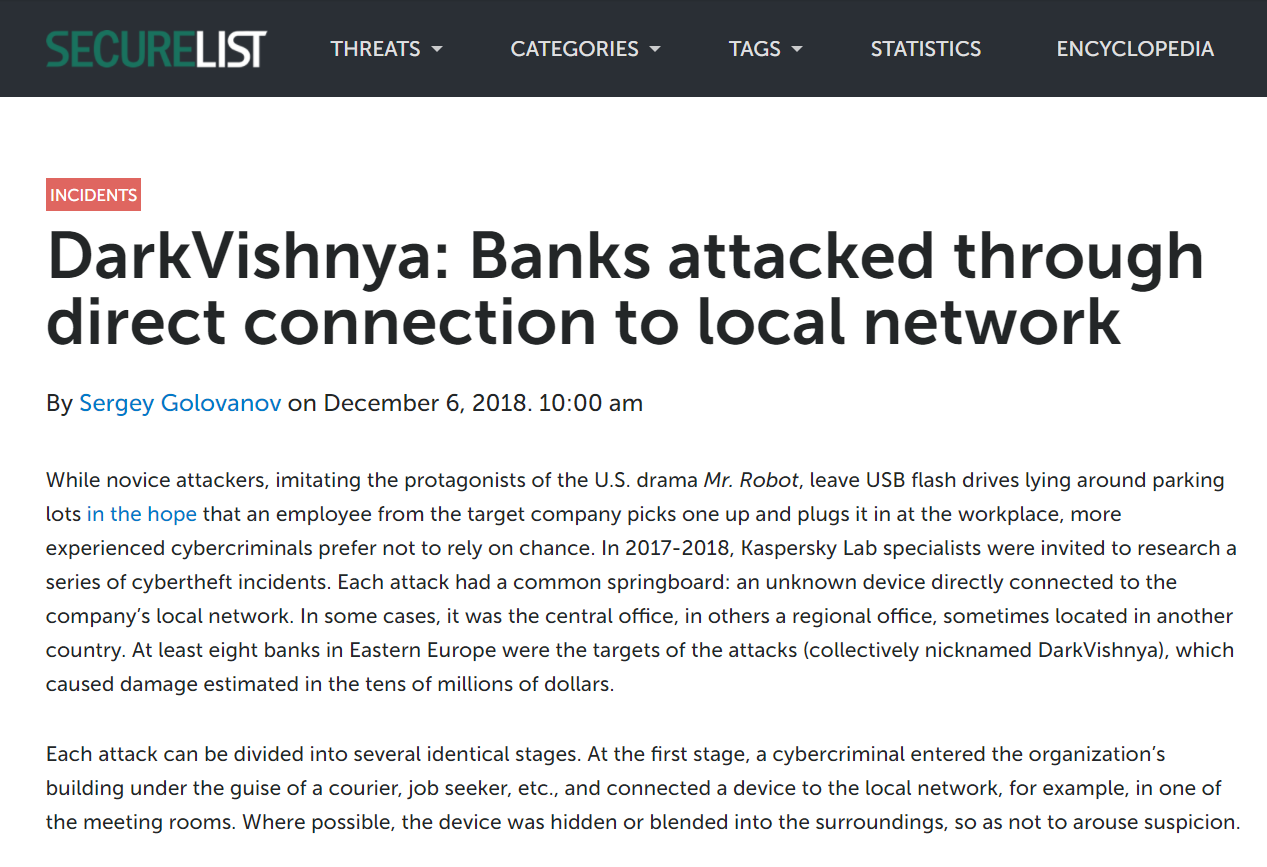 2017至2018年,Kaspersky实验室的专家被邀请研究一系列网络窃取相关事件,通过研究,这些事件都有一个共同的特征:即都包含一个连接到公司本地网络的未知直连设备。该设备可能被存放在任何位置,包括:办公室,区域办事处等。