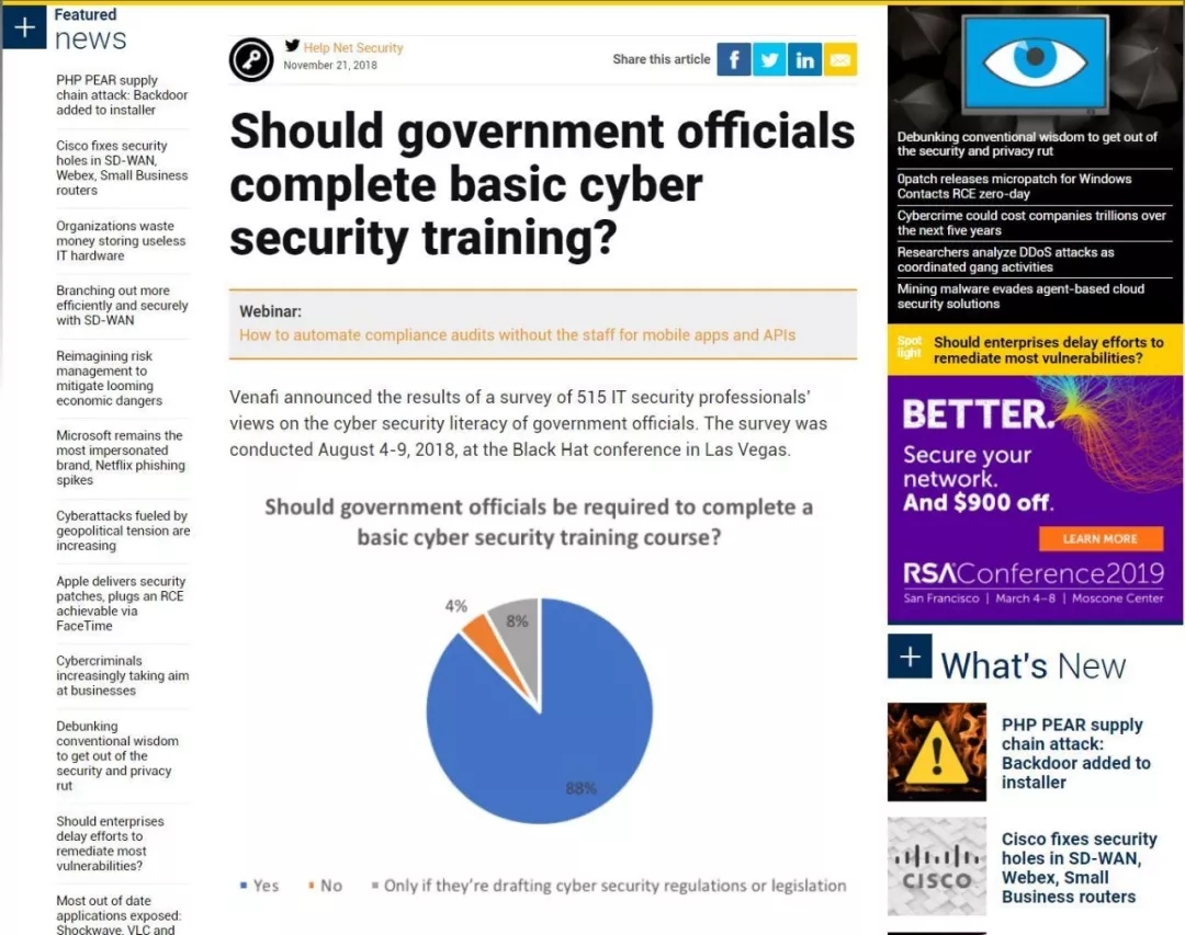 在拉斯维加斯举办的Black Hat上,一家网络安全公司 Venafi 对515名安全从业者进行了一项调查。其中一个问题是:政府官员需要完成基本的网络安全培训吗?