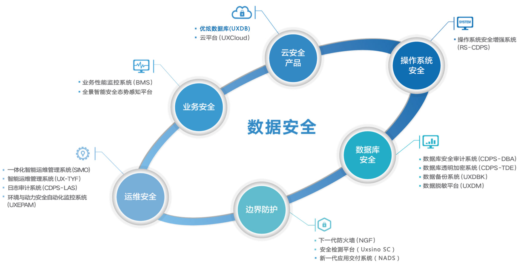 除此之外,优炫软件提供核心数据保护产品,六大产品体系囊括操作系统安全、数据库安全、云安全、运维安全、业务安全以及边界防护,共涵盖20余种安全产品,为企业提供完整的安全保护解决方案,帮助企业更加专注于业务本身。