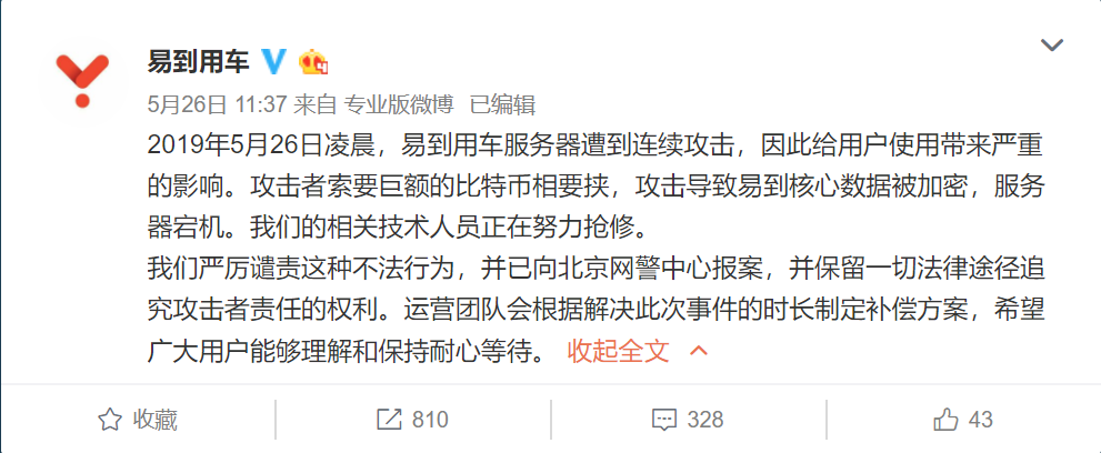 2019年5月26日,据易到用车官微消息,2019年5月26日凌晨,易到用车服务器遭到连续攻击,因此给用户使用带来严重的影响。据悉,攻击者索要巨额的比特币相要挟,攻击导致易到核心数据被加密,服务器宕机。