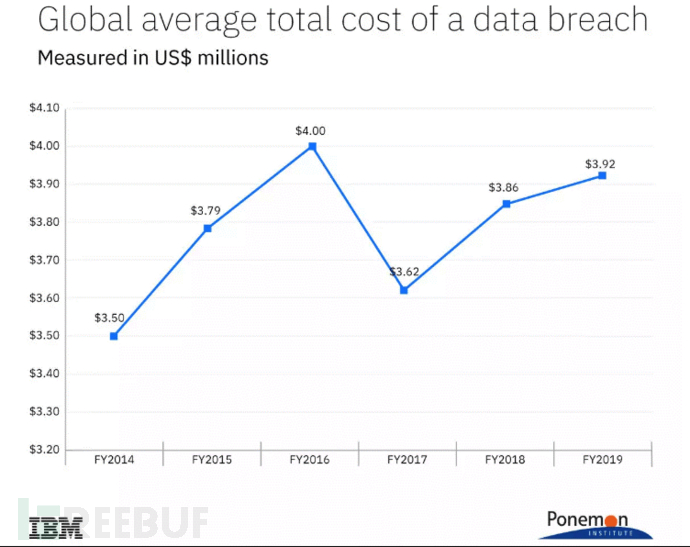 这些数据是根据Ponemon和IBM共同发布的第14份年度数据泄露成本报告得出的。这份报告对16个国家和地区以及17个行业部门的507家组织在2018年7月至2019年4月发生的数据泄露事件及其影响进行了调研。报告指出,从长期来看,数据泄露的平均总成本持续上升:过去五年,数据泄露事件的平均总成本增长了12%,高于2014年350万美元的平均值。