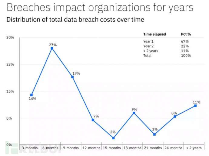 此外,修复攻击影响以及相应漏洞的时间也在逐渐增加。今年研究表明,修复漏洞以及缓解事件影响平均需要花费279天的时间,比之前的266天延长了4.9%。报告还发现,恶意网络攻击以及网络犯罪行所导致的数据泄露需要更长时间来修复和缓解:平均需要314天来识别和修复漏洞。当修复生命周期超过200天时,数据泄露的平均成本会高120万美元。