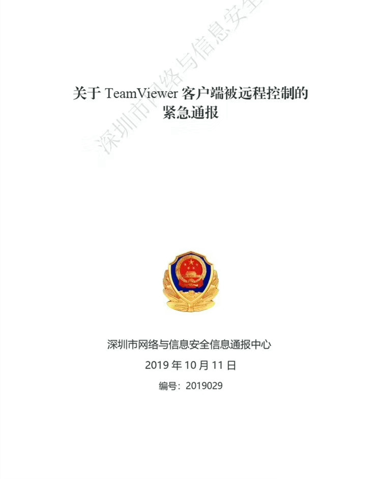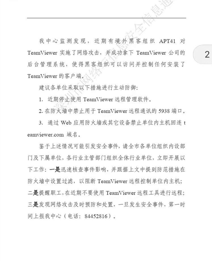 关于此事件,多个网络与信息安全监测与预警单位高度重视,江苏网警、深圳网络与信息安全信息通报中心等单位,相继紧急发布了TeamViewer安全通报及防护措施,提醒企业组织做好防护措施。