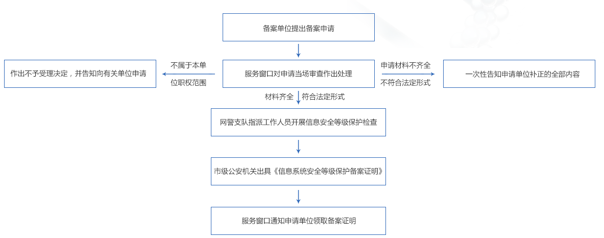 系统备案是指客户通过测评机构测评之后,去当地公安机关进行等级保护备案的过程。具体备案流程如下图所示: