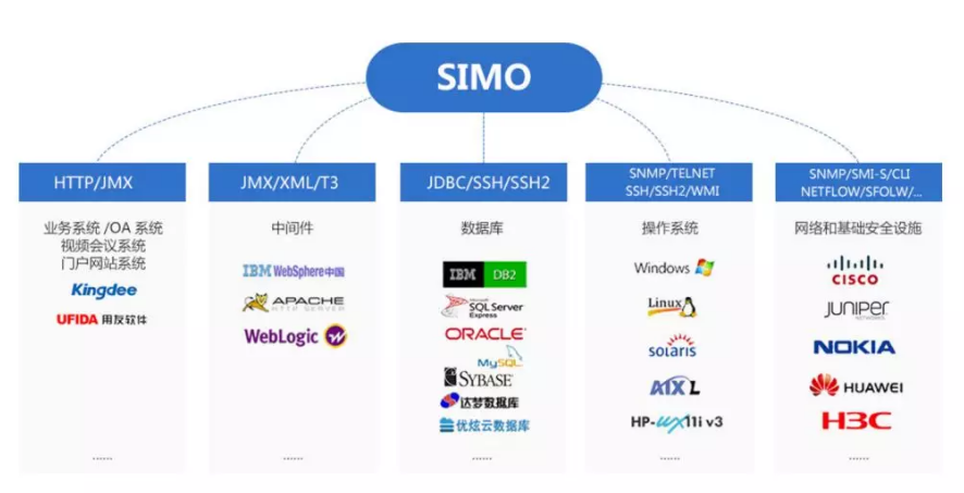 优炫一体化智能运维管理系统(System of Intelligent Monitor and Operation,简称SIMO)是一套功能强大的IT运维管理系统,定位于对网络系统和业务系统的统一有效的管理和运行维护,注重分析网络整体运维的特点,为客户提供服务器、网络设备、存储设备、中间件、虚拟化、数据库、公共应用、端到端链路等的集中运行维护解决方案。