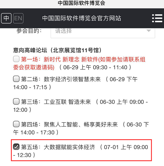 识别二维码后,进入H5,在H5尾页点击“点击报名”进入观众报名页面,报名时需要在意向高峰论坛中选择“大数据赋能实体经济”。