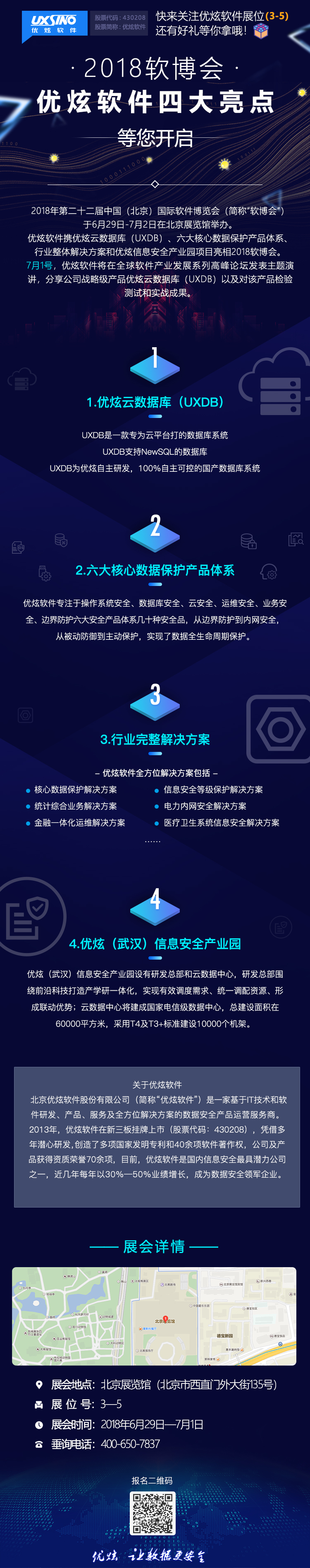 2018年第二十二届中国(北京)国际软件博览会(简称“软博会”)将于6月29日-7月2日在北京展览馆举办。软博会期间,优炫软件携优炫云数据库(UXDB)、六大核心数据保护产品体系、行业整体解决方案和优炫信息安全产业园项目亮相2018软博会。
