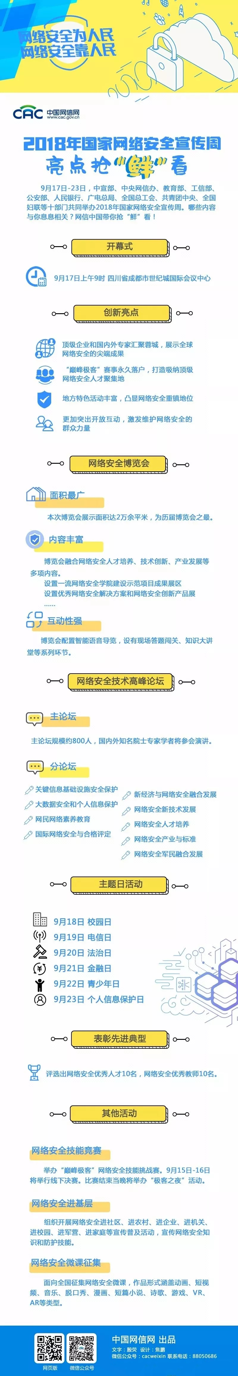 2018年国家网络安全宣传周由中央宣传部、中央网信办、教育部、工业和信息化部、公安部、中国人民银行、国家广播电视总局、全国总工会、共青团中央、全国妇联10部门共同举办,将于9月17日—23日举行,主题是“网络安全为人民,网络安全靠人民”。其中,开幕式、网络安全博览会、网络安全技术高峰论坛等重要活动将在成都举行。