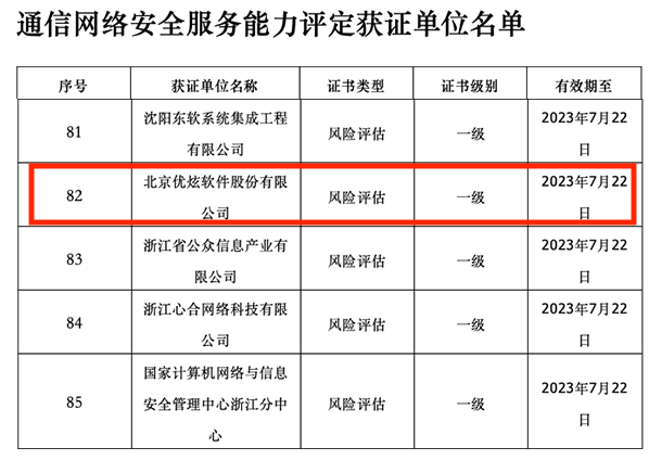 近日,中国通信企业协会通信网络安全专业委员会(以下简称:通信安委会)公布了获得通信网络安全服务能力评定证书的单位名单,优炫软件再次获得通信网络安全服务能力评定证书(风险评估一级)认证。通过这一评审,意味着优炫软件在通信行业的网络安全风险评估业务继续得到国家层面认可,激励优炫软件为用户网络安全防护提供更安全、更高效的应对方案。