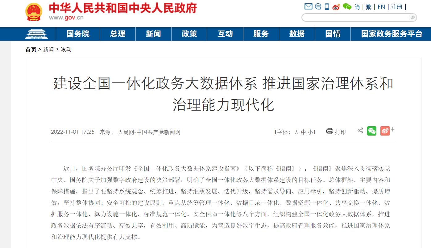 国务院办公厅发布《全国一体化政务大数据体系建设指南》(以下简称《指南》),为我国政务大数据体系建设描绘了新蓝图,将成为未来至少五年甚至更长周期中我国政务数据领域的顶层设计框架和体系架构,对加强数字政府的建设意义重大。