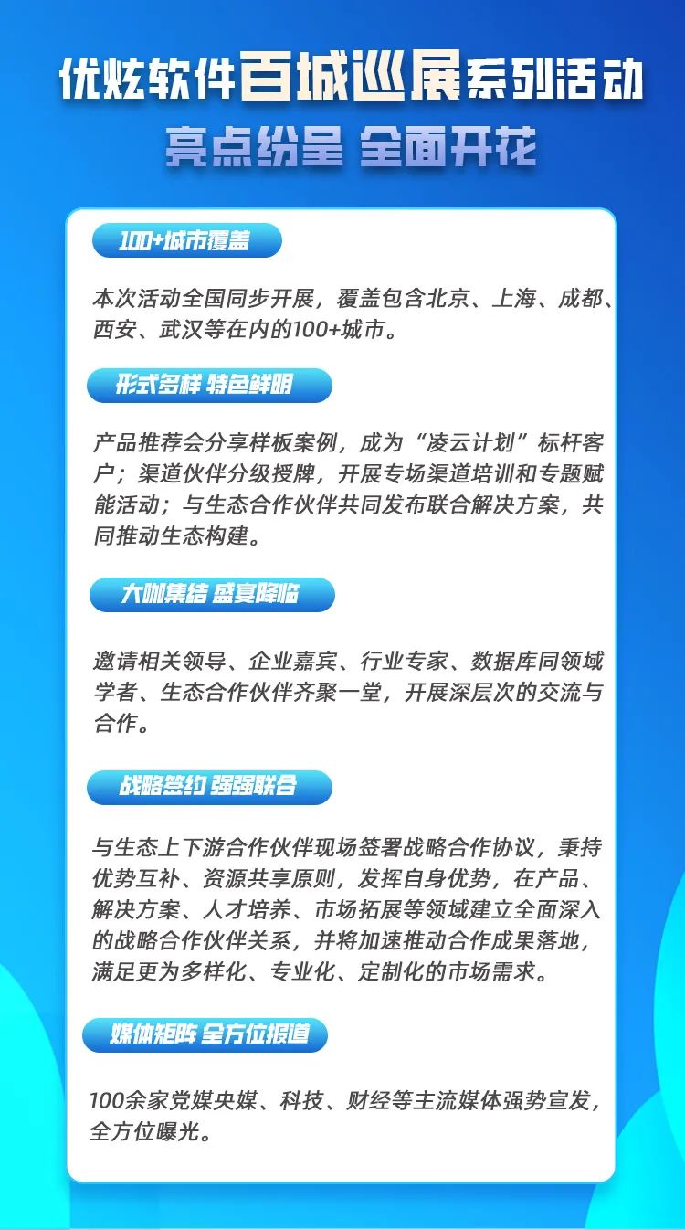 聚焦前沿技术创新与产业生态共建,优炫软件即将开启2023年百城巡展系列活动,深入全国各地市,与数万客户和合作伙伴一起共话数据库“新技术+新方案+新成果”,打造开放包容的数据库生态发展格局。