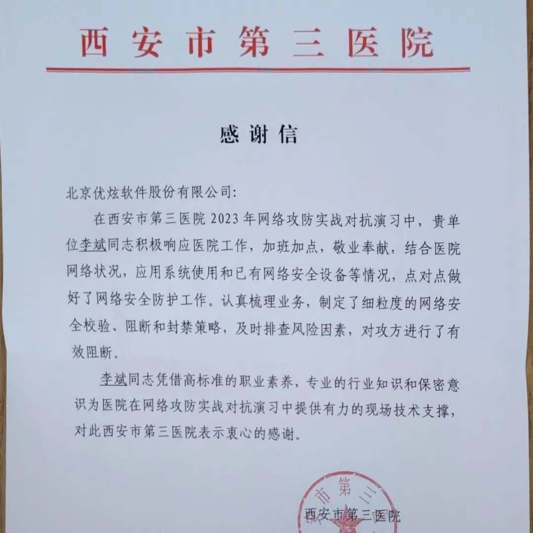 “李斌同志凭借高标准的职业素养,专业的行业知识和保密意识为医院在网络攻防实战对抗演习中提供有力的现场技术支撑对此西安市第三医院表示衷心的感谢“