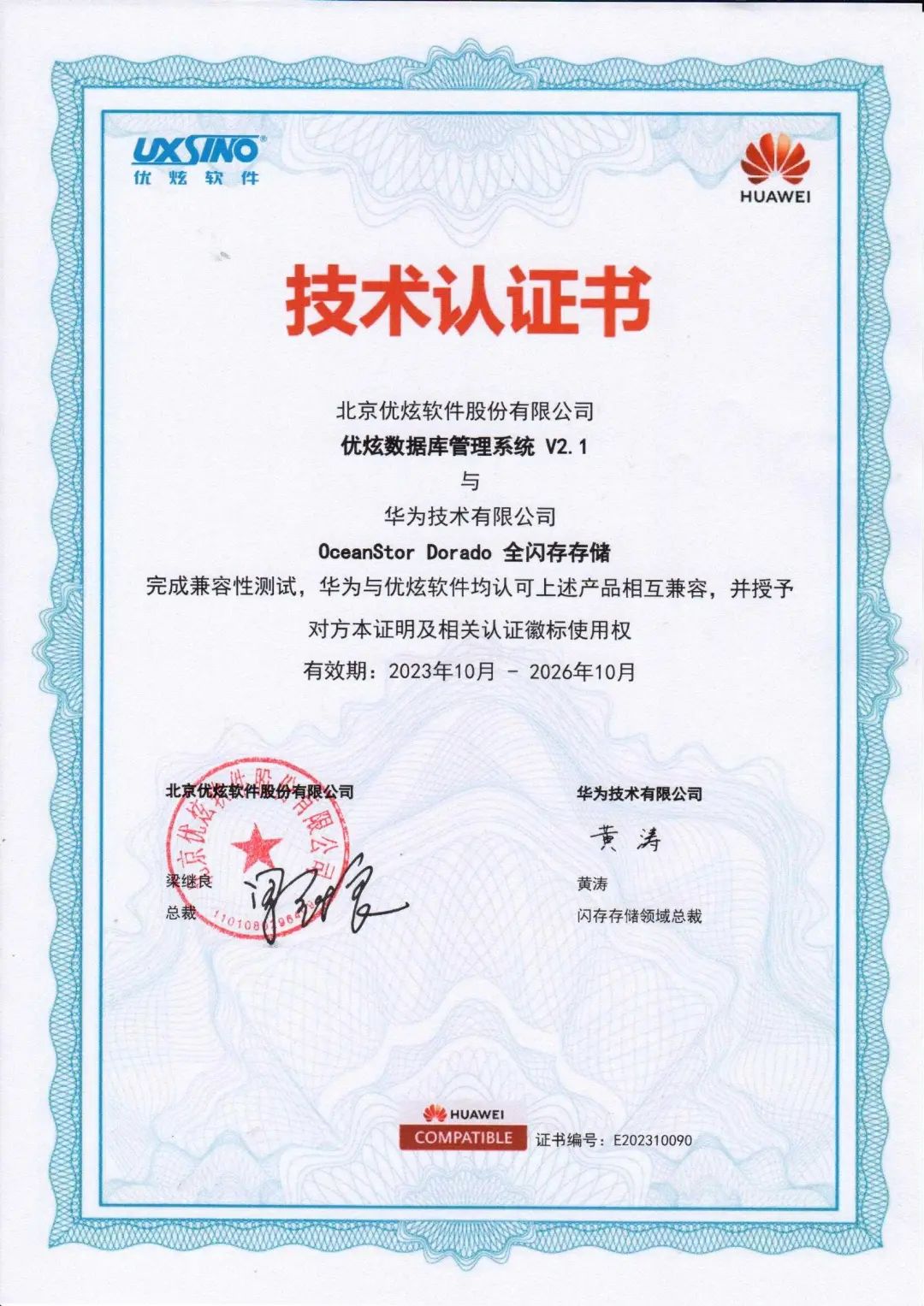 近日,北京优炫软件股份有限公司(以下简称“优炫软件”)与华为技术有限公司(以下简称“华为”)完成技术认证,优炫数据库管理系统V2.1与华为 OceanStor Dorado 全闪存存储完成产品兼容性测试,并正式签署互认证证书。