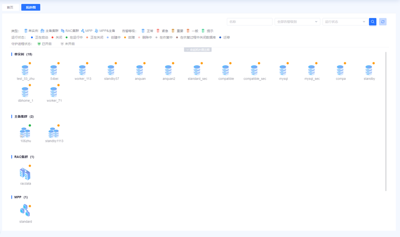 以图形化方式直观展示数据库的拓扑图,点击某一拓扑图即可进一步展示详细信息,方便管理及运维护人员对数据库环境的监控和管理。