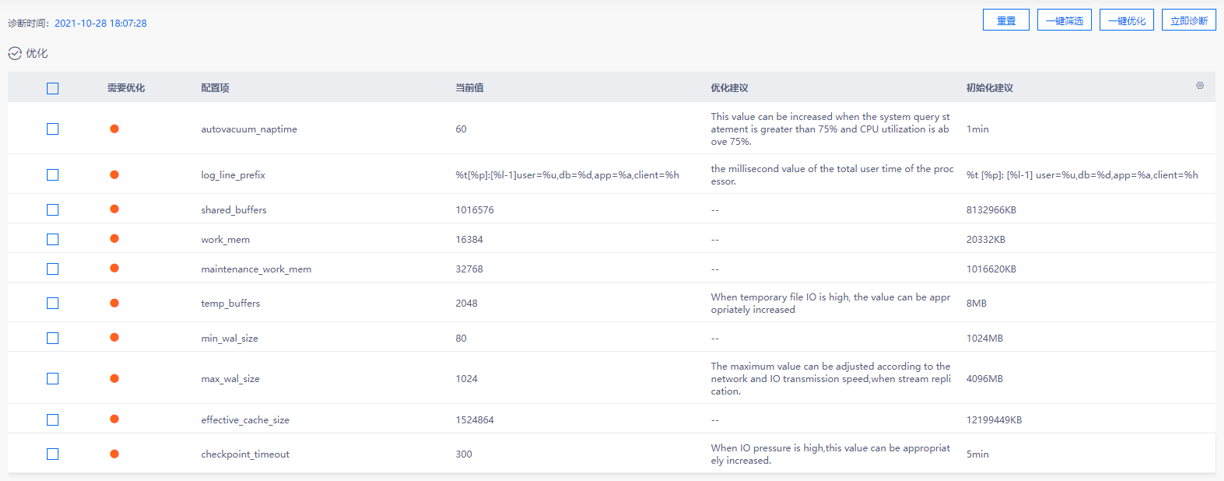通过智能诊断,可及时发现需要优化的数据库配置项,并通过“一键优化”进行配置项的优化。