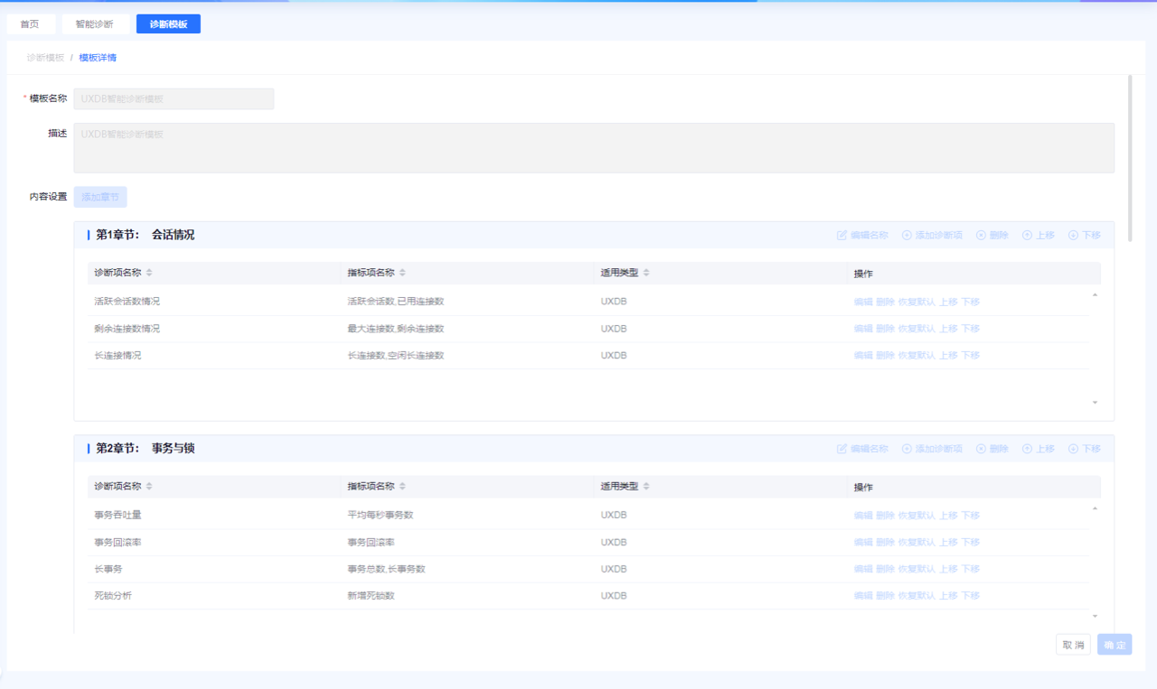 根据诊断模板,基于收集的数据库运行状态信息,对数据库的健康情况进行诊断。诊断模板中可配置的信息包括:会话情况、事务与锁、表与索引、性能、空间容量、归档日志、系统资源等。