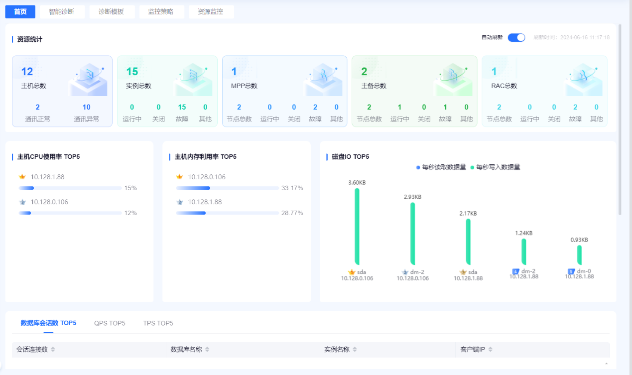 以图表方式展示数据库的资源统计及监控,告警信息以红色突出显示,以引起管理及监控人员的关注。