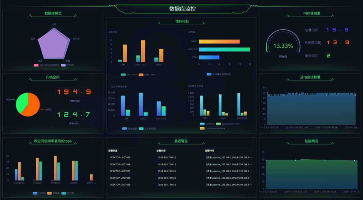 以图表方式在大屏上展示数据库的关键信息项,用户可根据需要自定义要展现的内容,并且大屏上显示的内容是动态刷新的。