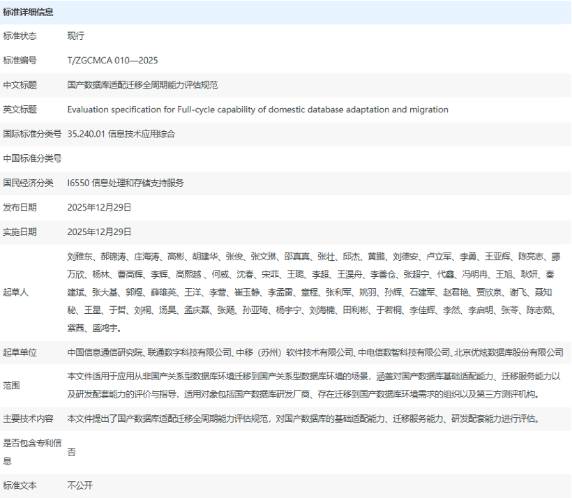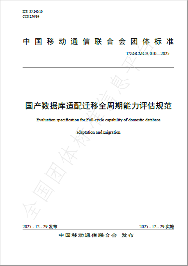 2025年12月29日,由北京优炫数据库股份有限公司参与起草的《国产数据库适配迁移全周期能力评估规范》标准(标准编号:T/ZGCMCA 010—2025)正式发布并实施,自此,国产数据库应用系统适配、迁移评估、数据迁移、数据比对有了可以遵循的规范。标准内容涵盖国产CPU、服务器、操作系统等基础软硬件适配能力、与非国产数据库产品在SQL语法和功能上的兼容度、全周期迁移服务能力等方面,适用于应用系统从非国产关系型数据库环境迁移到国产关系型数据库环境的场景。