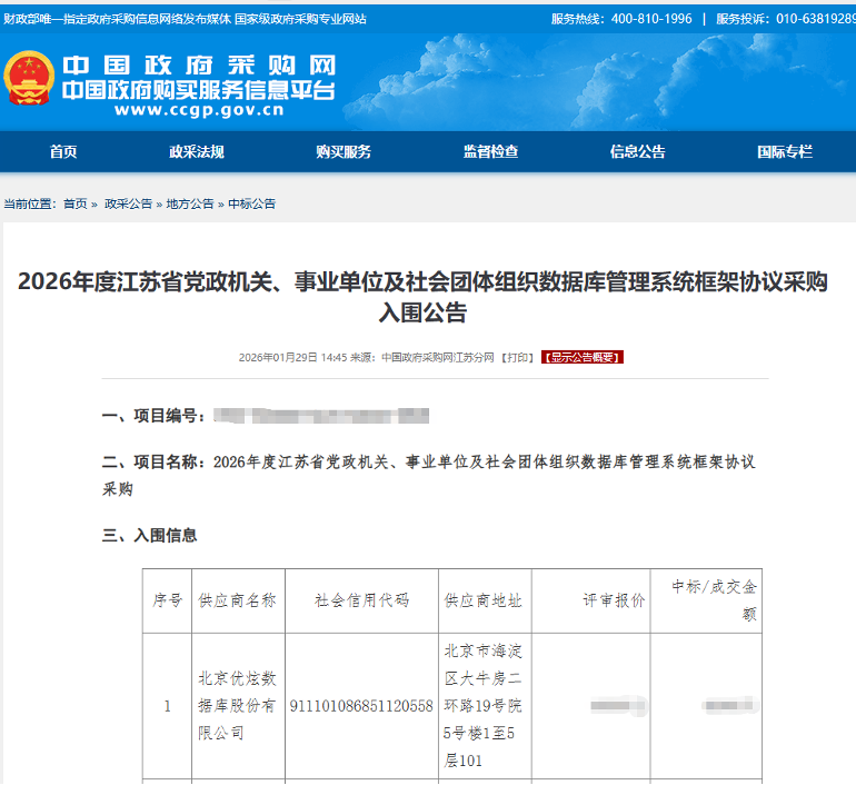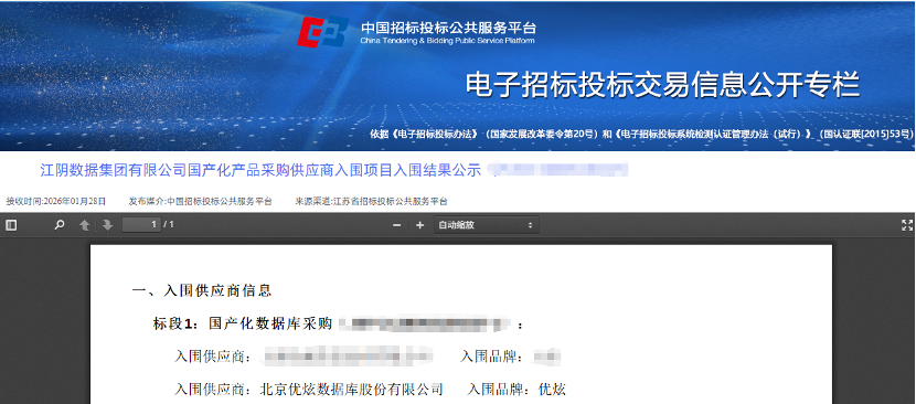 近日,北京优炫数据库股份有限公司再传捷报!凭借自主研发的核心技术与卓越的产品实力,公司成功入围《2026年度江苏省党政机关、事业单位及社会团体组织数据库管理系统框架协议采购》以及《江阴数据集团有限公司国产化产品采购供应商入围项目 标段1:国产化数据库采购》两大重要名录!