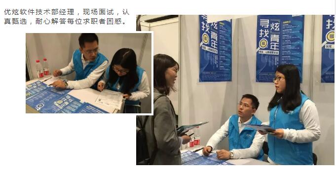 95后的小伙伴们就是充满激情和活力!我们的校招双选会还未开始就有很多同学来到现场,小编也是迷之感动啊!而我们的招聘专员成为现场最亮眼的一抹“优炫蓝”,以身体力行传递企业形象及文化。