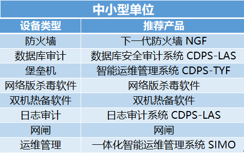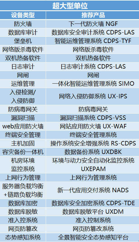 对于超大型企业,信息设备多而复杂,全方位的安全防护和管理以及智能化的需求更为迫切。另一方面在安全建设上资金投入较为充裕,因此我们推荐的配置会更为全面。