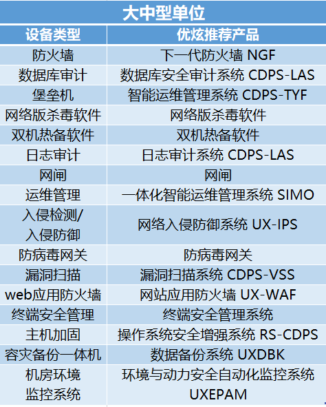 根据优炫软件多年相关安全建设的经验积累,特总结出一套信息安全三级等保的推荐配置套餐,以供广大用户参考。信息安全建设是一项需长期重视并不断完善的工作,该推荐配置是一个综合考虑后的建议,而非标准答案,欢迎有需要的客户联系我们,由专业的安全工程师为您的企业量身定制三级等保解决方案。