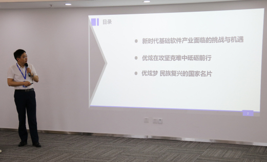 梁总首先致欢迎辞,他对清华EMBA校友的到来表示热烈欢迎,并希望通过深入交流促进彼此提升,愿大家对公司的发展建言献策。随后COO孙家彦在座谈会上做了《优炫梦,民族复兴的国家名片》的主题演讲,从新时代基础软件产业面临的挑战与机遇谈到优炫在攻坚克难中砥砺前行,最后总结优炫梦——民族复兴的国家名片的美好愿景。孙总的演讲让校友们深入地了解了优炫软件的发展现状和战略规划。
