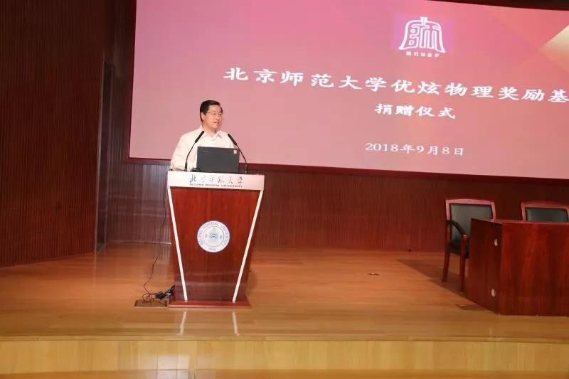 2018年9月8日下午,北京师范大学优炫物理奖励基金捐赠签约仪式在北京师范大学京师学堂京师厅举办。北京师范大学副校长周作宇,北京师范大学教育基金会秘书长张吾龙,北京师范大学物理学系分党委书记涂展春,物理学系副系主任黄文宏,北京师范大学物理学系校友、优炫软件董事长梁继良等校系领导与企业代表出席活动。活动由物理系副系主任黄文宏主持。