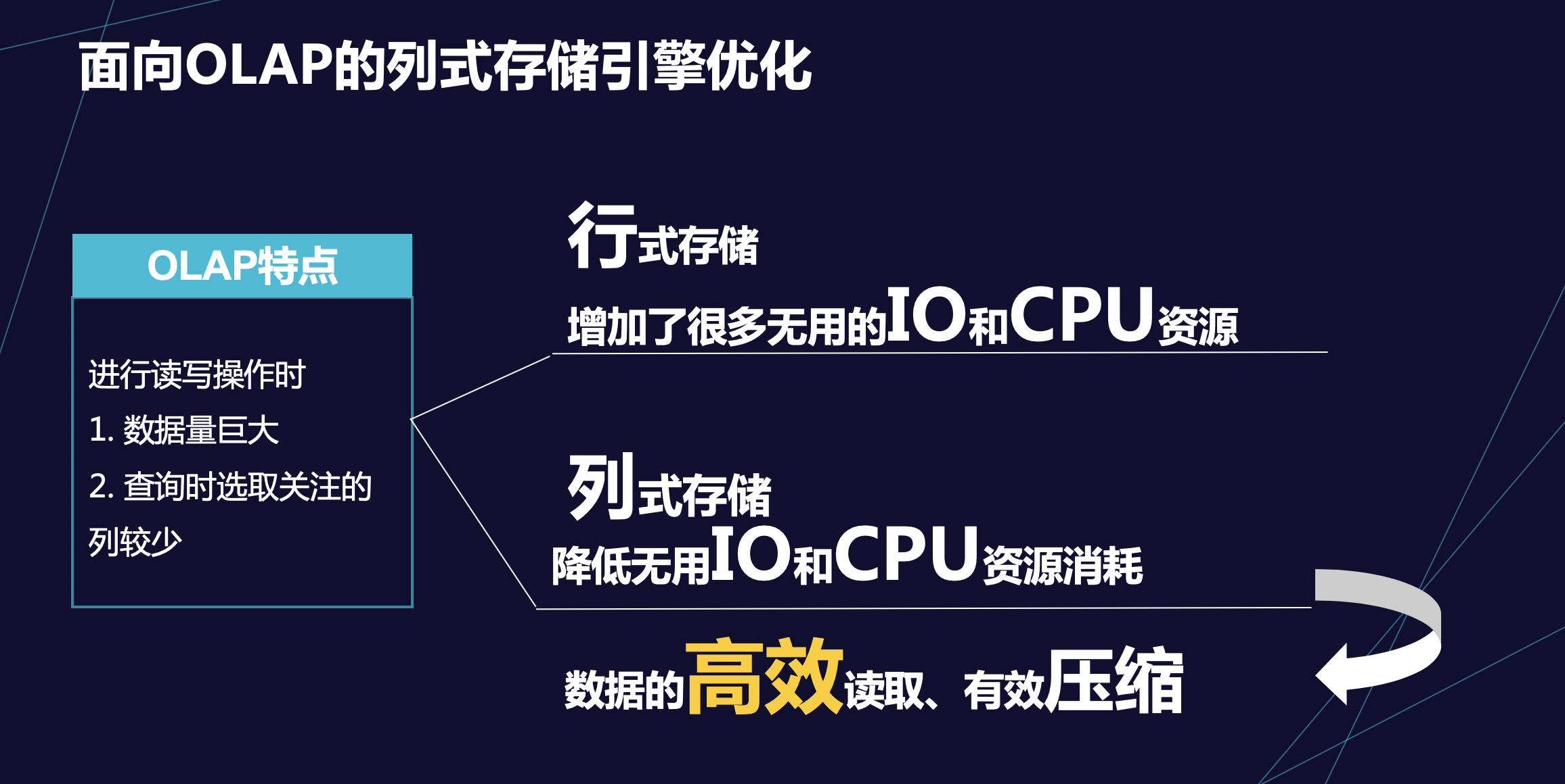 列存数据类型一致,数据特征相似,可大幅提高压缩比,有利于减小存储和网络带宽的消耗。同时列存只访问查询涉及到的列,可以大量降低系统I/O,提高性能,适合OLAP应用场景。